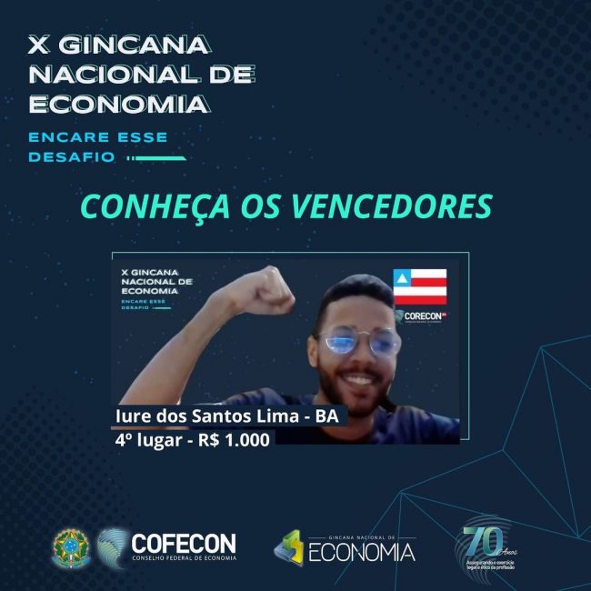 O estudante baiano Iure dos Santos (UEFS) está entre os vencedores da X Gincana Nacional de Economia. Ele participou da disputa com discentes de economia de todo Brasil e alcançou o quarto lugar. Em segundo lugar ficou Rafael de Souza Teixeira (UFJF), que ganhará R$ 2.000,00. O terceiro lugar foi de Gisele de Paiva Furieri…