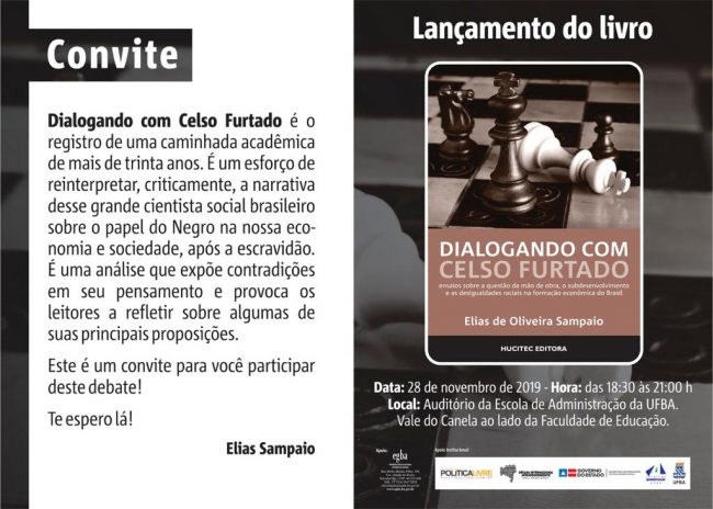 Lançamento acontece no dia 28 de novembro na Escola de Administração da UFBA O economista Elias Sampaio lançará, no próximo dia 28, no auditório da Escola de Administração da UFBA, a partir das 18h30, seu mais novo livro: Dialogando com Celso Furtado – Ensaios sobre a questão da mão de obra o subdesenvolvimento…