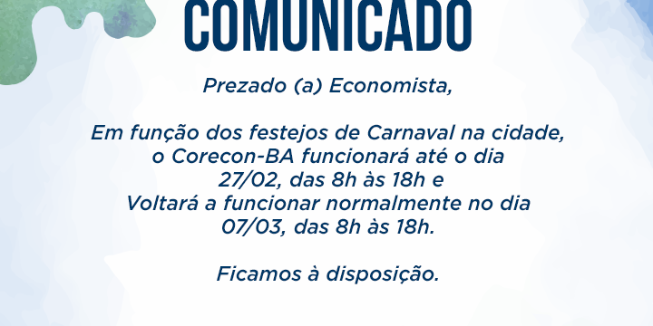 fev272019Notícias Categoria: NotíciasPor Lívia Santana27 de fevereiro de 2019 Compartilhe esta notícia Share on FacebookShare on Facebook Share on XShare on X Share on LinkedInShare on LinkedIn Share on WhatsAppShare on WhatsApp Related postsCorecon Bahia homologa resultado da Eleição 2025 para renovação de Conselheiros (mandato 2026–2028)27 de novembro de 2025Manual de Perícias em parceria com o Corecon-BA oferece condições exclusivas6 de novembro de 2025III Seminário Mulher Economista e Diversidade: saiba como foi a noite de abertura 3 de novembro de 2025Informativo sobre o pleito eleitoral de 2025 dos Conselhos Regionais de Economia27 de setembro de 20253º Seminário Nacional da Mulher Economista e Diversidade: Carta de Salvador9 de setembro de 2025Lançamento de obra celebra legado intelectual do economista Fernando Pedrão16 de agosto de 2025